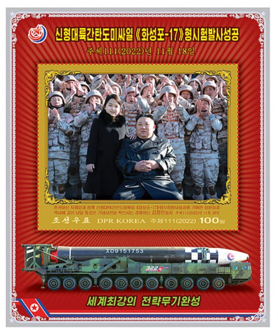 북한 조선우표사는 14일 김정은 국무위원장과 딸 김주애(앞줄 왼쪽)의 사진을 담은 우표 도안을 공개했다. 17일 발행 예정인 새 우표 도안 8종 가운데 5종에 ‘존귀하신 자제’란 표현과 함께 김주애가 대륙간탄도미사일(ICBM) ‘화성-17형’ 발사를 참관하는 모습이 담겼다. 북한이 김주애를 담은 우표를 발행한 것은 처음이다.