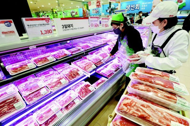 1일 서울 중구 롯데마트 서울역점에서 직원들이 돼지고기를 진열하고 있다. 롯데마트는 1일부터 5일까지 국내산 냉장 삼겹살과 목심을 행사 카드 결제 시 50% 할인하는 ‘삼겹살 데이’ 행사를 진행한다.