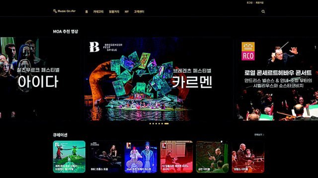 앱을 내려받은 뒤 기자에게 제공된 시험용 시청 아이디로 뮤직온에어에 접속해 봤다. 브레겐츠 페스티벌에서 공연된 ‘리골레토’ ‘카르멘’ 등 야외 오페라, TV 시청자를 포함해 세계에서 가장 많은 클래식 팬이 접하는 영국의 BBC 프롬스 음악축제, 전설적인 베토벤 해석가로 손꼽히는 피아니스트 루돌프 부흐빈더의 베토벤 피아노소나타 전곡 영상 등 다양한 메뉴가 가득 펼쳐졌다. 리골레토 메뉴를 누르니 기자가 현장에서 관람했던 장대한 야외오페라의 스케일이 풀HD 고해상도 영상으로 재생됐다.