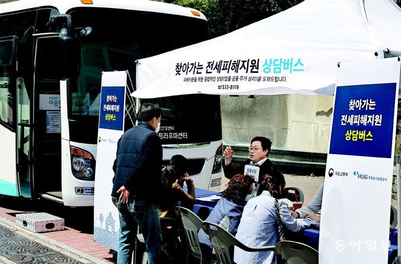 21일 오후 인천 미추홀구 주안역 광장에서 전세사기 피해자들이 국토교통부가 운영하는 ‘찾아가는 전세피해지원 상담버스’에서 법률 상담을 받고 있다. 법률 심리상담부터 피해지원 프로그램 안내까지 종합적으로 지원하며 퇴근 후에도 이용할 수 있도록 낮 12시부터 오후 8시까지 운영한다.