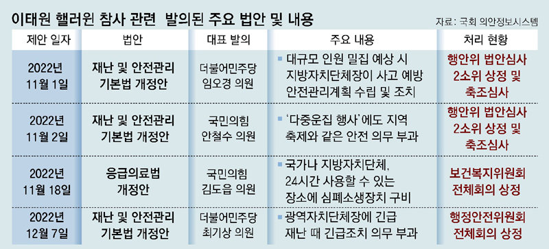 실제로 지난해 11월 민주당 임오경 의원이 대표 발의한 재난안전법 개정안에는 대규모 인원 밀집이 예상될 때 지자체장이 사고를 예방하기 위해 사전에 안전관리계획을 수립하고, 조치를 취하도록 하는 내용을 담았다. 또 행정안전부 장관이 안전관리계획의 이행 실태를 지도·점검하도록 하는 내용도 포함됐다. 또 국민의힘 조수진 의원이 지난해 11월 대표 발의한 재난안전법 개정안에는 심리상담 지원 대상으로 재난 피해 당사자뿐만 아니라 긴급구조활동과 응급대책 등에 참여한 자원봉사자 등도 포함되는 내용이 담겼다. 이태원 참사 당시 구조 활동에 나섰던 시민들이 정신적 고통을 호소한 것에 대한 대책이었다.