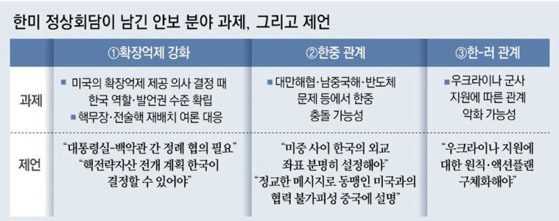 윤석열 대통령과 조 바이든 미국 대통령 간 정상회담은 안보 분야에서 성과와 함께 적잖은 과제를 남겼다. 윤 대통령이 핵심 성과로 제시한 ‘워싱턴 선언’을 통해 북한의 핵 공격 시 미국이 핵을 포함한 신속한 보복 대응을 약속하고 양국 간 핵협의그룹(NCG)을 창설했다. 대북 확장억제(핵우산) 실행력을 강화한 것이다.