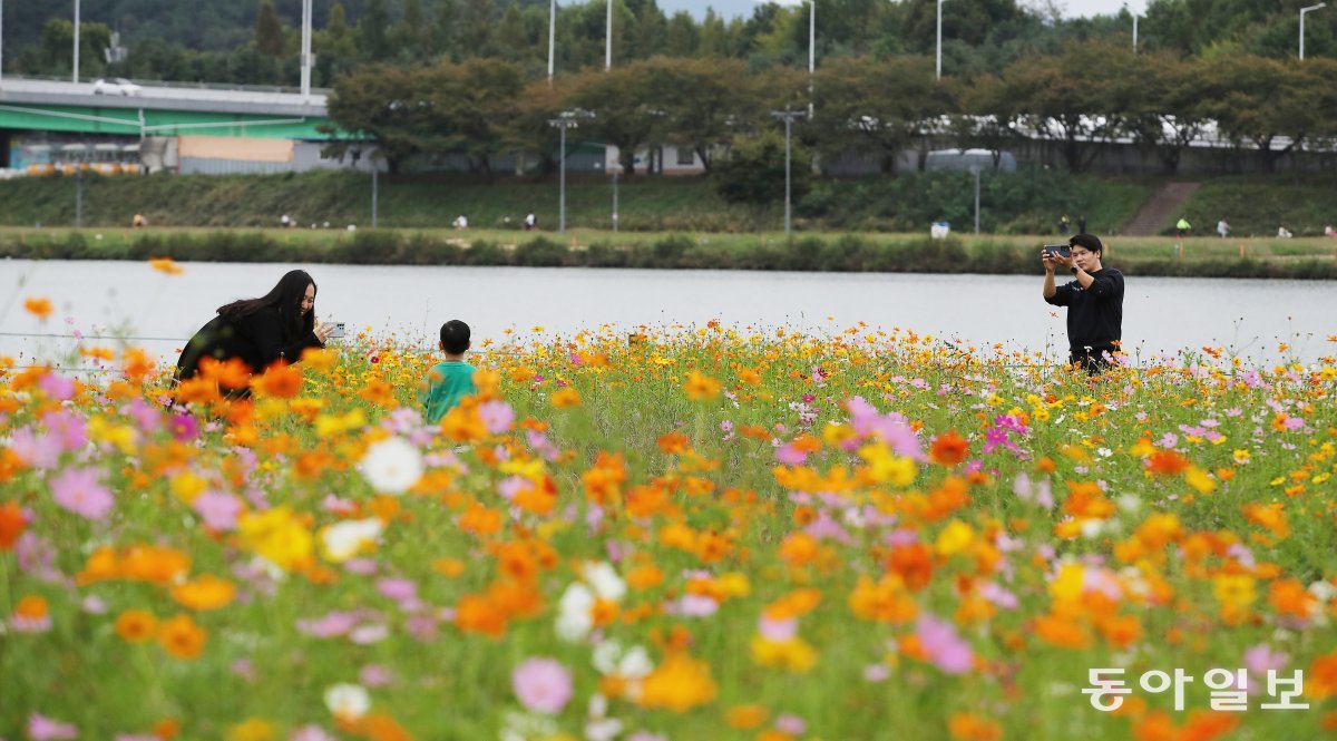 대전 유성구 갑천변 둔치에 코스모스가 만개해 가을 분위기를 끌어올리고 있는 가운데 시민들이 꽃을 배경으로 사진을 찍고 있다.