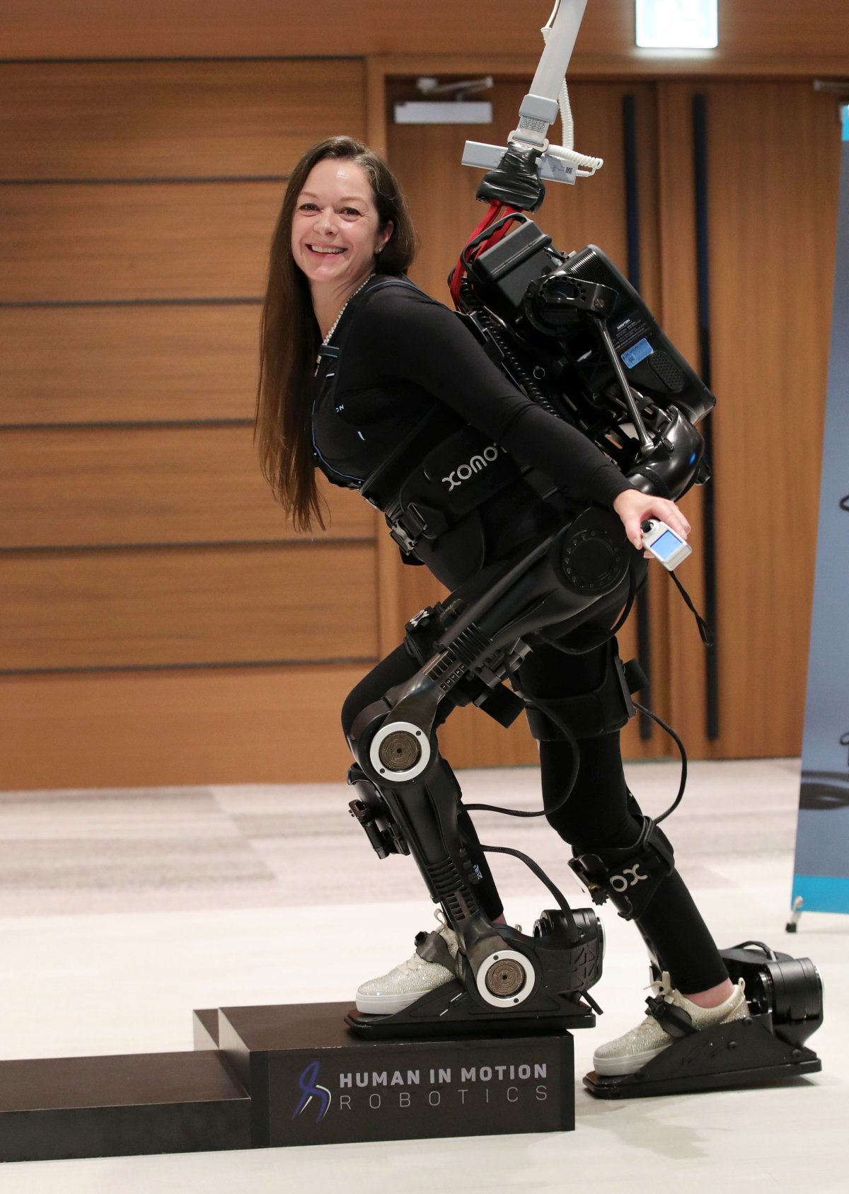 26일 서울 중구 노보텔 앰배서더 동대문에서 열린 ‘2023 베노티앤알 웨어러블 로봇 시장 진출 기자간담회’에서 하반신 마비 장애인인 클로이 앵거스 씨가 이족보행 웨어러블 로봇 ‘엑소모션’을 착용하고 보행하고 있다.