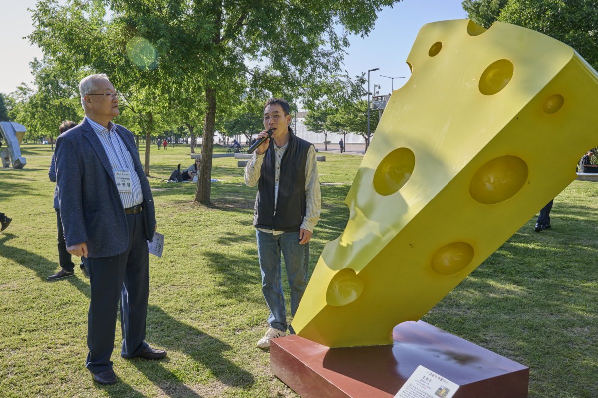 견생조각전 100회 기념전에서 윤영달 크라운해태제과 회장이 김정도 작가의 '옮겨진 치즈' 작품 설명을 듣고 있다.