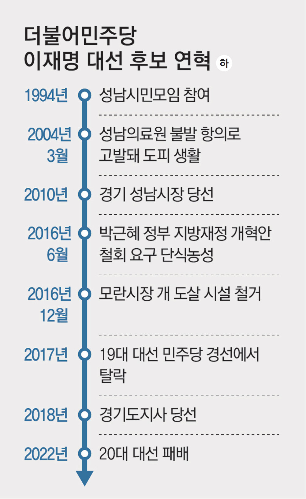 2004년 3월 경기 성남시 수정구 주민교회 지하 기도실. 바닥에 앉아 있던 40세의 이재명 변호사(현 더불어민주당 대선 후보)는 노동조합 활동가 정해선 씨의 “이 변호사가 시장으로 나와 보라”는 말에 웃음을 터뜨리며 이렇게 말했다고 한다. 성남의료원 설립 운동을 했던 이 후보는 당시 성남시의회에서 병원 설립 운영 조례안 심의가 일방적으로 보류되자 시의원들에게 욕설을 하거나 잡아끈 혐의(특수공무집행 방해)로 고발돼 수배되자 은신하던 중이었다. 병원 설립 운동을 함께 했던 정 씨는 “이 후보는 당시 수배 중이라 어둡고 습한 지하실에 숨어 씻지도 못한 모습이었다”며 “울면서 ‘선거에 나와 달라’고 했는데 고민을 많이 했는지 이후 2006년 성남시장 선거에 출마했다”고 일화를 소개했다. 이 후보는 자서전에서 정 씨의 제안에 대해 “정치로의 길에 들어서는 순간이었다”며 “내 자리는 늘 가장 치열한 전선이었다”고 밝혔다.