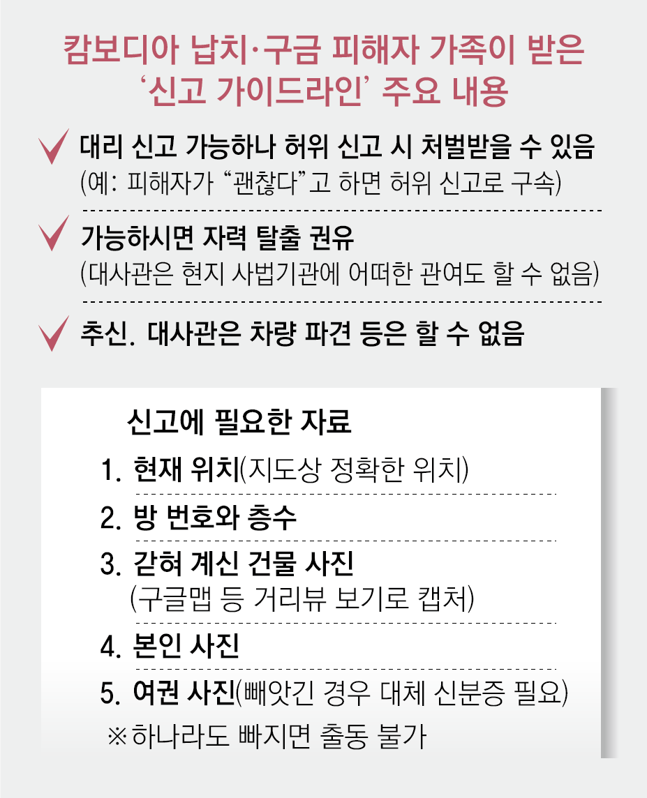 손 씨는 “아들이 캄보디아에 있다는 사실 외엔 아무 정보도 없는데, 건물 동호수까지 알아서 신고하라는 안내에 막막했다”며 “여권이고 신분증이고 다 빼앗겼고, 결국 신고 자체가 불가능했다”고 말했다. 손 씨가 제공한 문서는 실제 대사관 홈페이지에 게시된 ‘취업사기 감금 시 경찰 신고 방법’과 대부분 일치했다.