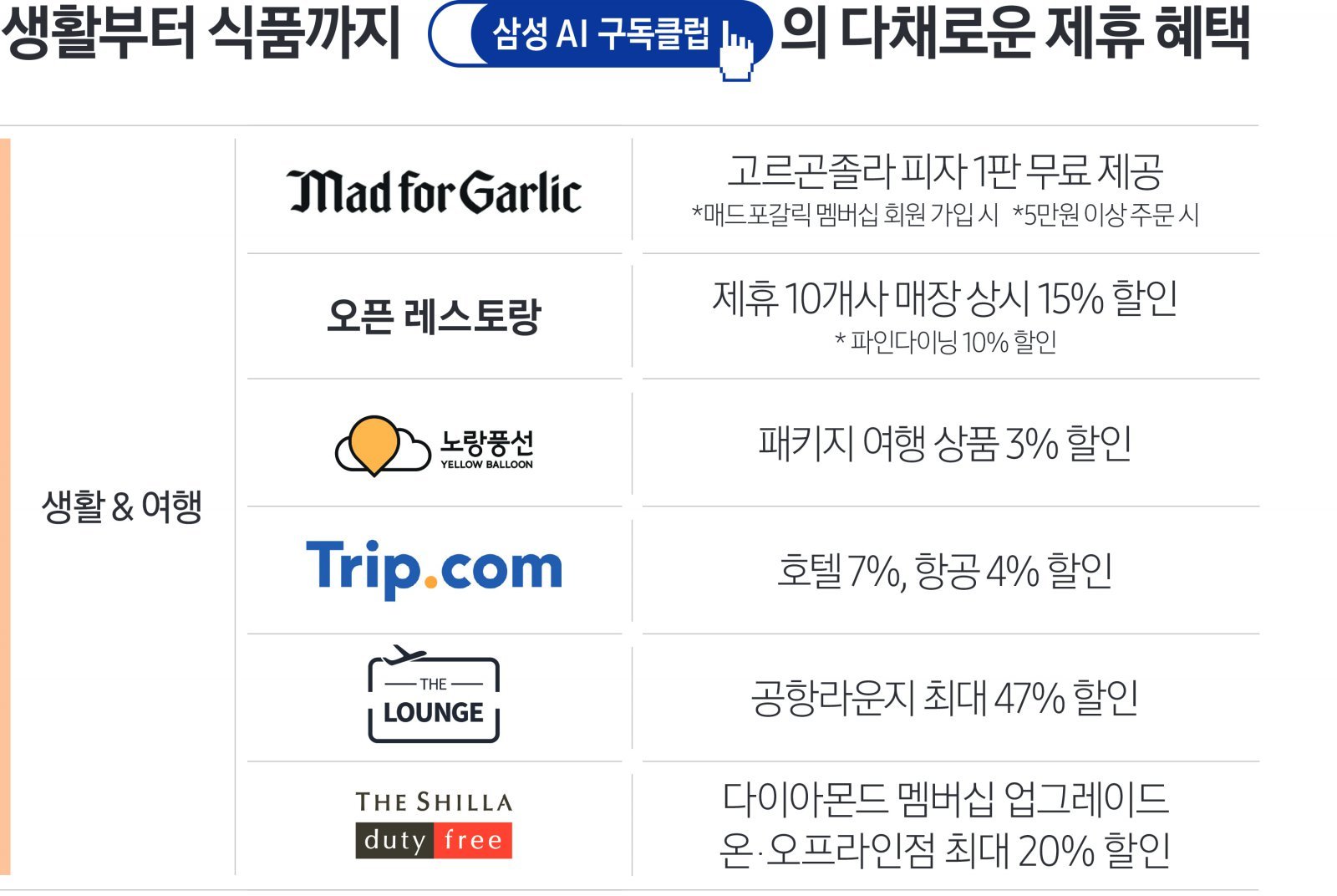※제휴 혜택 내용은 제휴사 사정으로 변경 가능하며, 변경 내용은 삼성닷컴에서 확인 가능 ※제휴사와의 계약 종료 시 제휴 혜택은 사전 고지 없이 종료될 수 있음 [매드포갈릭]※고르곤졸라 피자 1판 무료 제공 혜택은 주문 전 매드포갈릭 멤버십 회원 가입 및 본 삼성닷컴 쿠폰 제시 후 사용할 수 있으며, 5만 원 이상 주문 조건으로 일행당 1장 사용 가능함 ※제휴·카드, 통신사 멤버십, 메뉴 할인권 중 택1 하여 1회 중복 가능(단, 타 메뉴 쿠폰과는 중복 사용 불가) [오픈 레스토랑]① 대상 매장 상시 15% 할인(단, 파인다이닝인 ‘라벤더’는 10% 할인) ②생일, 상견례, 기념일 방문 시 와인 1병 제공(단, ‘여의도감’ ‘영통백합칼국수’ 제외) ③4인 이상 방문 시 스페셜 메뉴 제공(단, ‘라벤더’ ‘여의도감’ ‘영통백합칼국수’ 제외) [신라면세점]※멤버십 혜택 유효기간은 1년이며, 멤버십 등급은 최초 가입일부터 1년간 유지, 삼성 AI 구독클럽 가입일부터 5년간은 동일 등급 재가입이 가능하며 5년 경과 시에는 재가입 불가, 멤버십 유효기간 1년 경과 시 동일한 재가입 절차 필요함 [노랑풍선]※AI 구독클럽 가입일로부터 5년간 총 3회 할인 지원됨 [트립닷컴]※AI구독클럽 제휴 할인은 트립닷컴에서 제공하는 AI 구독클럽 회원 전용 웹사이트 및 모바일 앱에서 구매 시에만 제공 가능하며, 다른 결제 수단과 함께 사용할 수 없음. ※호텔의 경우 온라인 사전 결제 호텔만 적용 가능하며, 항공의 경우 유류 할증료 및 기타 세금을 제외한 항공 운임료에서 할인이 적용됨 [CGV]※제휴쿠폰 유효기간은 쿠폰에 기재된 유효기간에 따르며, 발급된 예매권의 사용기간은 영화 종영 시까지 사용할 수 있음. 배급사 사정에 따라 영화는 조기에 종료될 수 있음 ※본권은 2D 일반 영화에 한해 사용 가능함. 특별관, 특별좌석 등 일부 극장 사용 좌석 및 차액 지불 불가함 [에버랜드]※삼성전자 AI 구독클럽 회원 전용 링크를 통해 1년권 구입 시 구입 익월 15일 1만 솜 포인트 증정 (앱쿠폰) -권종별 이용 제한일은 에버랜드 통합 앱에서 확인 가능함 ※삼성전자 삼성 AI 구독클럽 회원 전용 링크를 통해 매월 4일 에버랜드 솜 룰렛 참여 시 100% 솜 포인트 증정 (앱쿠폰) [밀리의 서재]※제휴 혜택 유효기간: 1년(삼성 AI 구독클럽 가입일로부터 5년간 동일 할인 혜택으로 재구매 가능) [HD현대오일뱅크]※스마트 주유 결제 가능 시간은 06시부터 23시까지임. [한국타이어]※삼성 AI 구독클럽 고객 대상, 티스테이션닷컴 내 한국타이어 상품 최대 25%+all my T 5% 할인 제공(경정비 사용 불가) [SK스피드메이트]※엔진오일은 ZIC X7, ZIC TOP, 캐스트롤, 쉘 기준이며, 에어·오일필터는 SK 기준품에 한해 제공 ※에어컨 가스는 친환경 냉매차량은 서비스 제외되며, 본 쿠폰은 1년간 1회 사용 가능함(5년간 매년 지급) [쏘카]※60% 할인 혜택은 반드시 2주 전 예약 및 10시간 이상 카셰어링 대여 시에만 제공(내륙 지역 한정) ※카셰어링 대여 할인은 이용 요금 중 대여 요금에 한해 적용되며 면책상품 요금, 주행 요금에는 적용되지 않음. 울릉도를 제외한 전국 내륙 지역과 제주도에 있는 차를 대여할 때 적용될 수 있음 [CJ 더마켓·풀무원몰·오뚜기몰·목우촌·MYCHEF·정원e샵·모모스커피·포어르몰]※결제일 할인 혜택은 식품 구매 시 삼성카드 결제조건 필수임 ※오프라인 매장은 혜택 제외되며, 법인·체크·선불·기프트카드 불가함