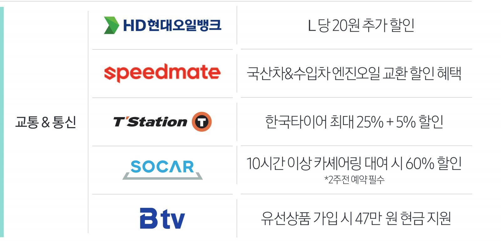 자차로 출퇴근하는 직장인들은 HD현대오일뱅크 주유비 할인 혜택과 SK스피드메이트의 엔진오일·에어컨 필터 교체 할인 혜택을 통해 차량 유지비까지 절감할 수 있다.