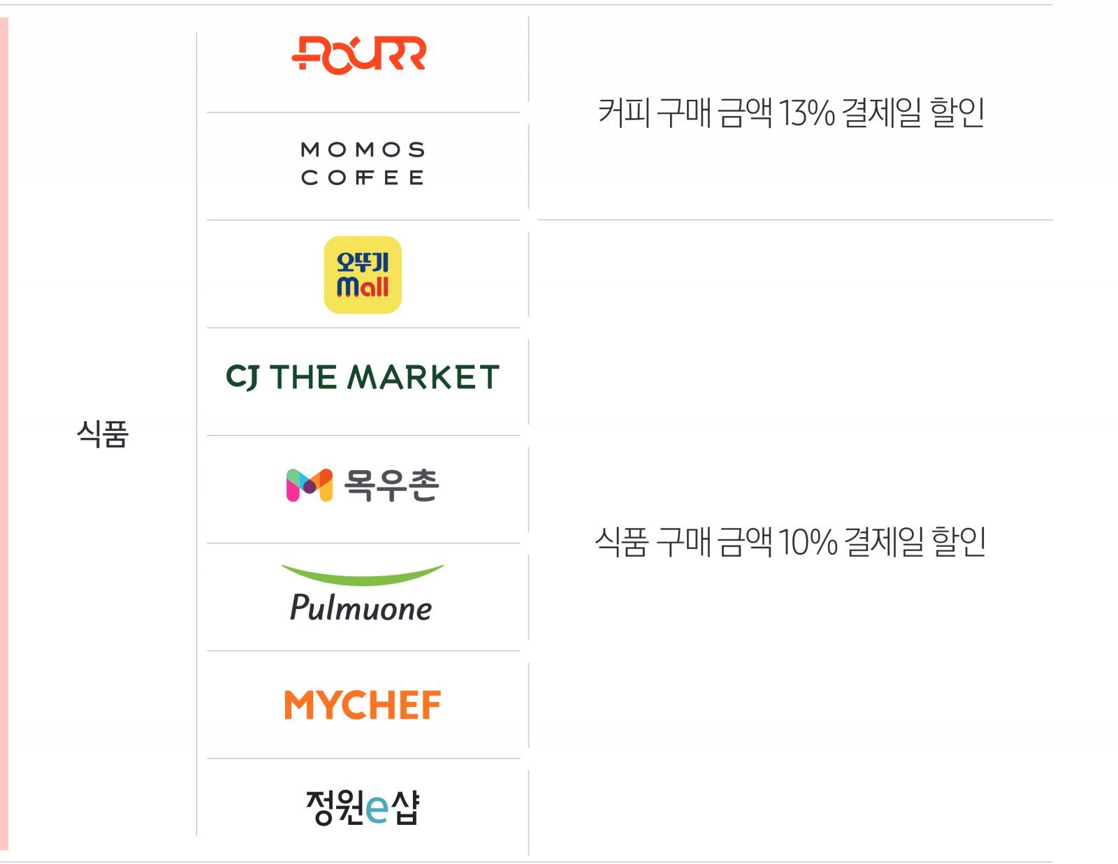 CJ더마켓, 풀무원몰, 오뚜기몰, 정원e샵, 목우촌, MYCHEF 등 6개 주요 브랜드몰에서 식품을 구매하면 브랜드몰의 다양한 할인 혜택도 받을 수 있고, 제휴 혜택인 10% 결제일 할인까지 추가로 적용돼 매월 지출하는 식료품비 부담을 줄일 수 있다.