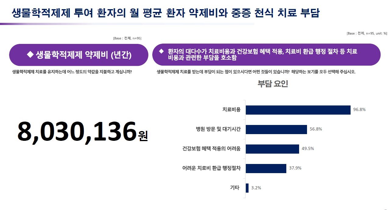 응답자들은 생물학적 제제 치료를 받는데 부담이 되는 요인으로 ‘치료 비용’(96.8%)을 가장 많이 꼽았다. 이어 병원 방문 및 대기 시간(56.8%), 건강보험 혜택 적용의 어려움(49.5%) 순이었다.