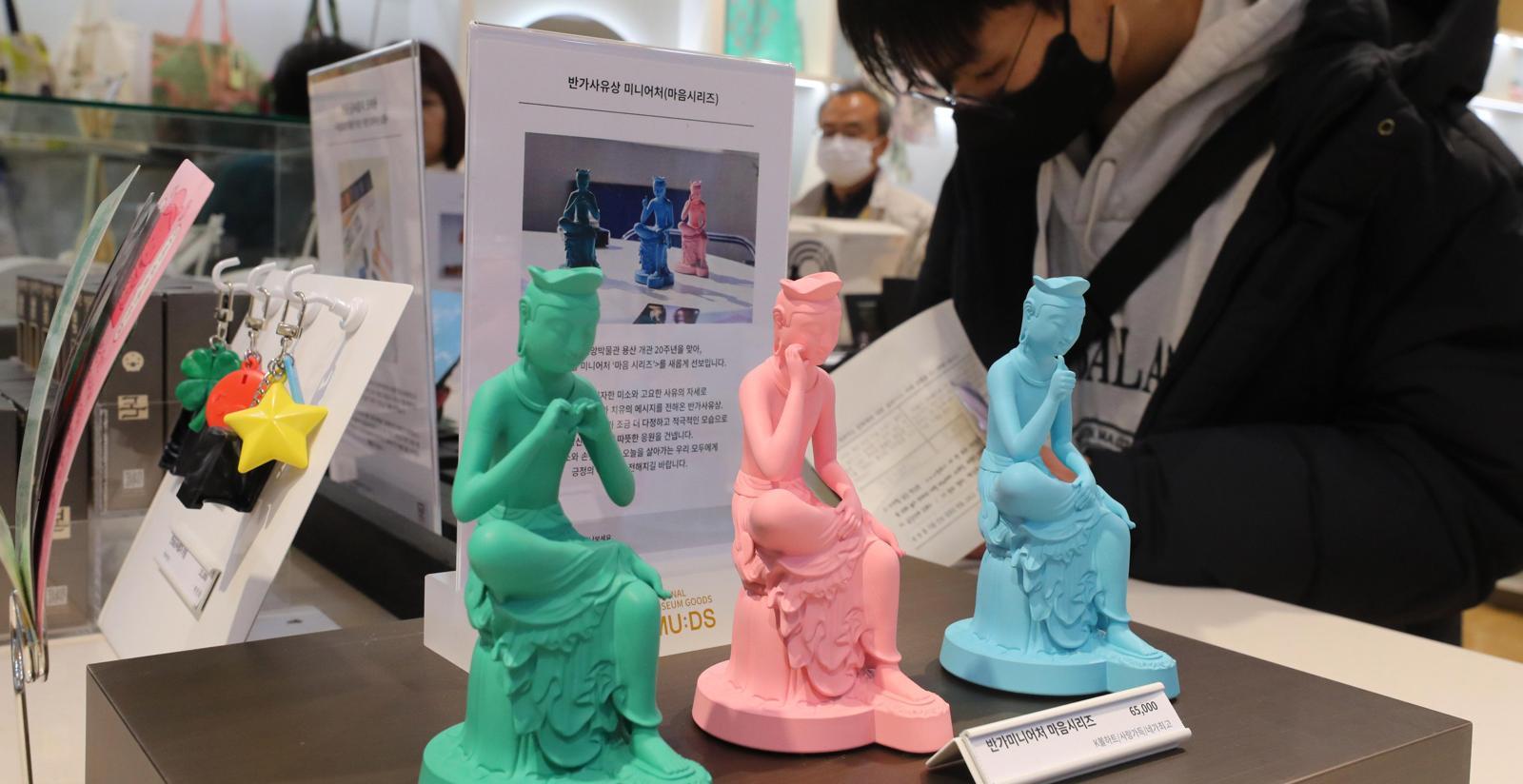 3일 서울 용산구 국립중앙박물관 내 ‘뮷즈’ 매장을 찾은 관람객이 반가사유상 굿즈를 살펴보고 있다. 국립박물관문화재단에 따르면 올해 1∼10월 박물관 문화상품 ‘뮷즈’ 매출액은 306억 원에 달했다. 뮷즈 연간 매출이 300억 원을 넘어선 건 2004년 재단 설립 이후 처음으로, 박물관의 전시 공간 개편과 넷플릭스 ‘케이팝 데몬 헌터스’의 인기 등이 효과를 낸 것으로 풀이된다.