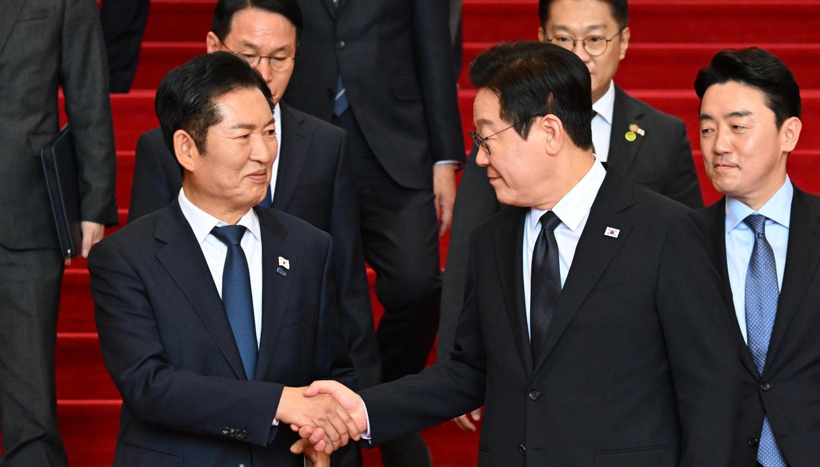 이재명 대통령이 4일 국회에서 내년도 정부 예산안 시정연설을 마친 후 더불어민주당 정청래 대표(왼쪽)와 악수하고 있다. 민주당이 현직 대통령의 형사재판을 중단하도록 하는 ‘재판중지법’(형사소송법 개정안) 추진에 나섰다가 대통령실의 제동으로 이를 철회한 다음 날 이 대통령과 정 대표가 만났다. 대통령실사진기자단