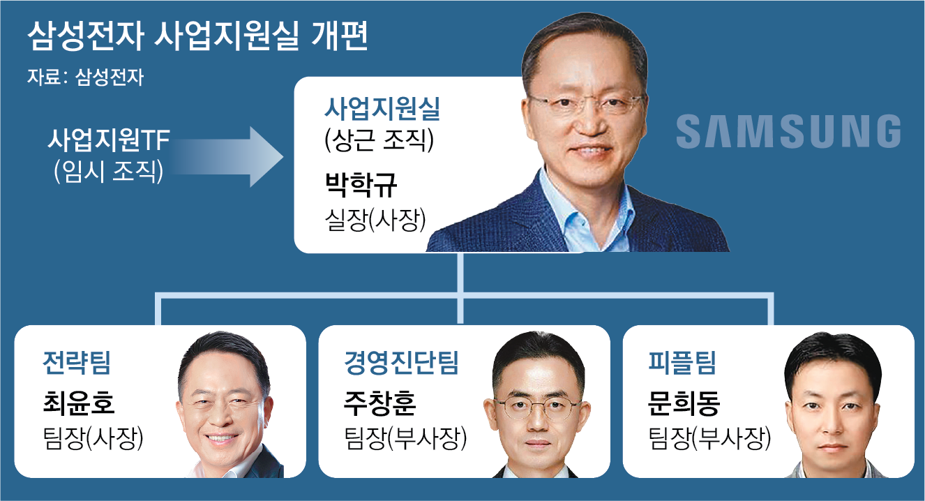 이와 동시에 사업지원TF가 정식 조직인 사업지원실이 됐다. 사업지원실은 전략팀, 경영진단팀, 피플팀 등 3개 팀으로 구성됐다. 전략팀장은 최윤호 경영진단실장(사장)이 맡게 됐다. 박 사장과 최 사장 모두 삼성전자 경영지원실장을 거쳤다. 이 밖에 주창훈 부사장이 경영진단팀장, 문희동 부사장이 피플팀장에 각각 선임됐다.