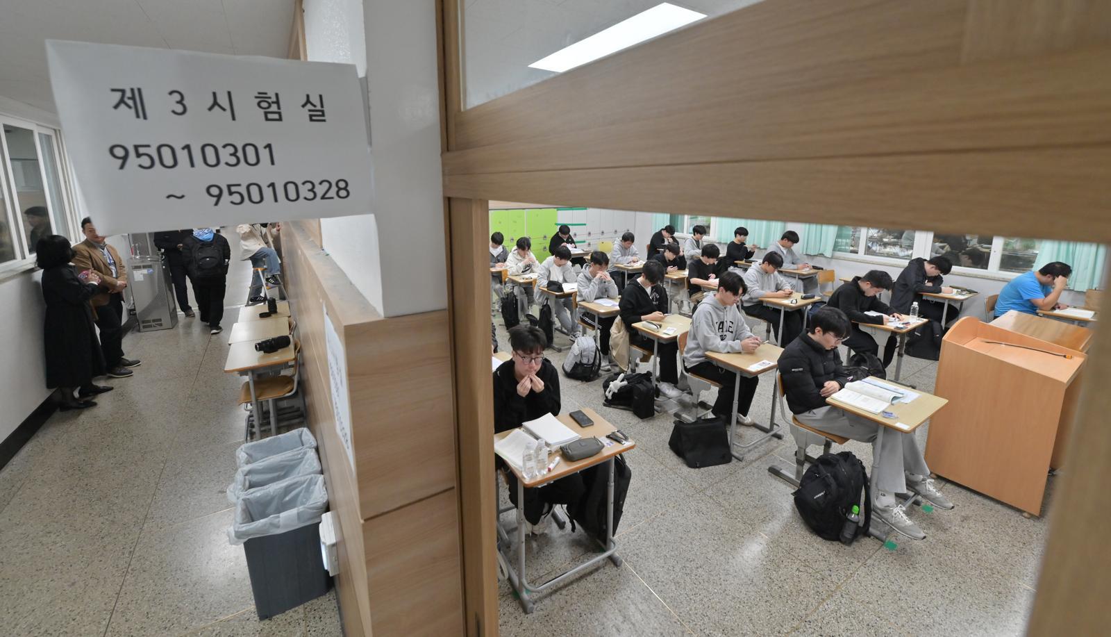 2025학년도 수능일에 남녕고등학교에서 수험생들이 시험을 앞두고 마지막 정리를 하며 시험 준비를 하고 있다. 뉴스1