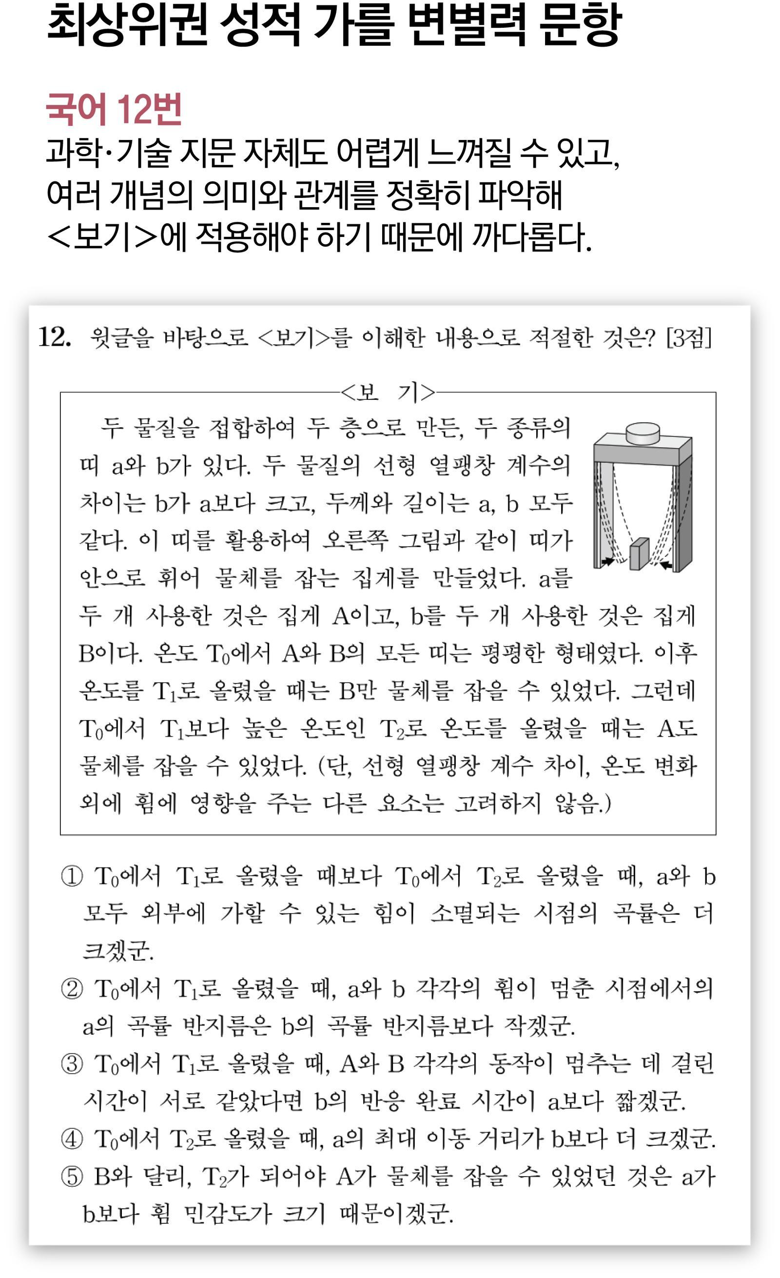 열팽창 현상을 소재로 한 지문을 제시한 뒤 열팽창 계수와 곡률, 휨 민감도, 반응 완료 시간 등 의미를 파악해 보기의 상황에 적용할 수 있는지를 묻는 12번 문제(홀수형 기준)가 고난도였을 것으로 분석됐다. EBS 수능 교재에 나오는 지문을 활용했다지만, 수험생들은 과학기술 지문을 어려워하는 경향이 있다. EBS 국어 대표강사인 한병훈 충남 덕산고 교사는 “과다한 추론을 요구하지 않고 지문에 명시적으로 근거가 있어 ‘킬러 문항’이라고 할 수 없다”며 “해당 유형은 9월 모의평가에서도 나왔다”고 말했다.