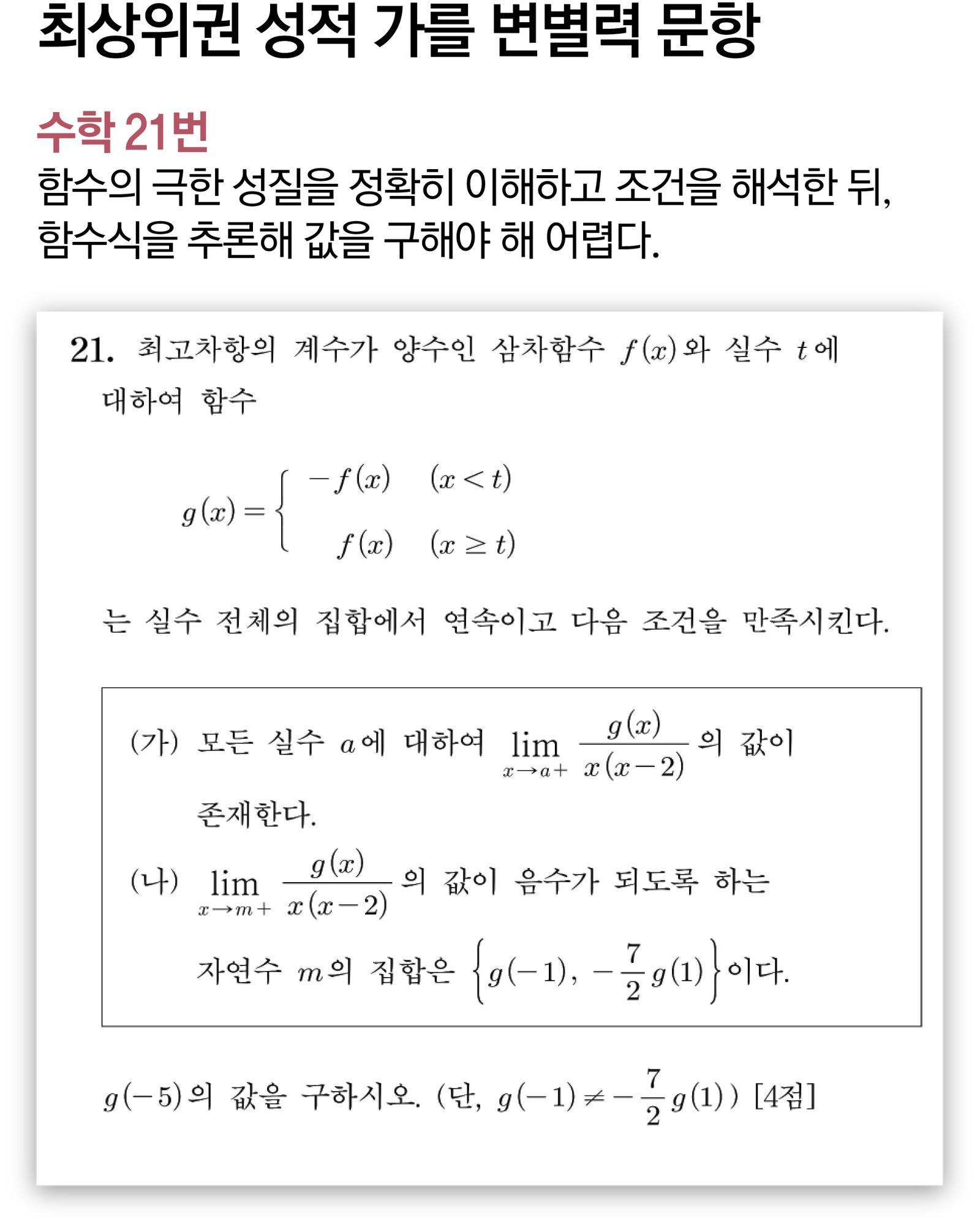 9월 모의평가에서는 선택과목 미적분, 기하, 확률과 통계 간 표준점수 최고점 격차가 3점에 불과했는데 이번 수능에서는 이를 조정하면서도 인문계열이 주로 택하는 확률과 통계를 좀 더 어렵게 출제하고, 자연계열이 많이 보는 미적분은 약간 평이해 선택과목 간 점수차를 줄이려 했다는 분석도 나왔다.