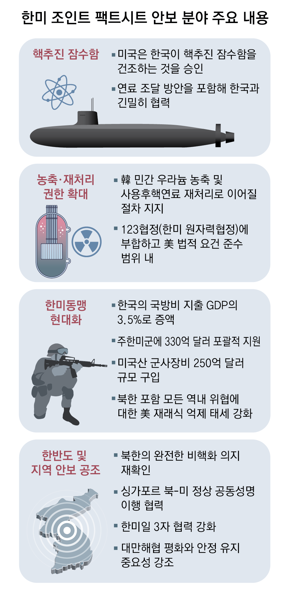 이날 공개된 팩트시트에는 “미국은 한국이 핵잠을 건조하는 것을 승인(approval)했다. 미국은 이 조선 사업의 요건들을 진전시키기 위해 연료 조달 방안을 포함해 한국과 긴밀히 협력해 나갈 것”이라는 문구가 담겼다.