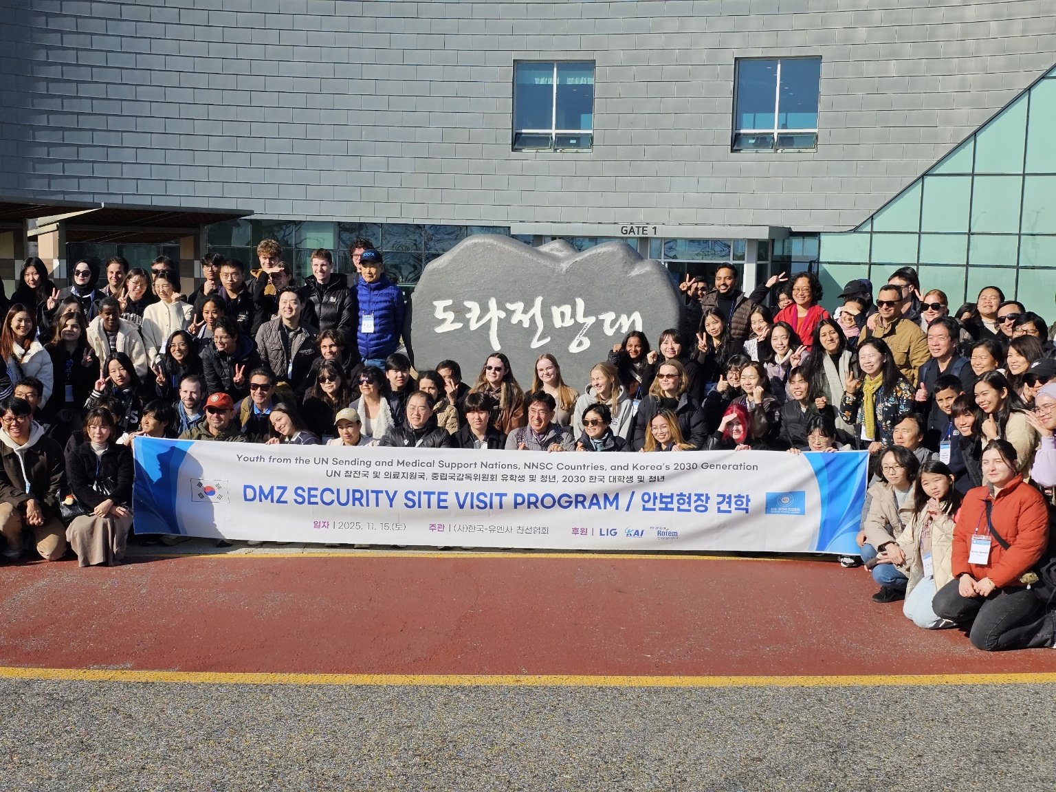 15일 한국유엔사친선협회(KUFA)가 주관한 ‘2025 DMZ 안보현장 견학행사’에 참석한 유엔 참전국 대학생과 외교관, 한국 대학생들이 경기 파주 도라전망대에서 기념촬영을 하고 있다. KUFA 제공
