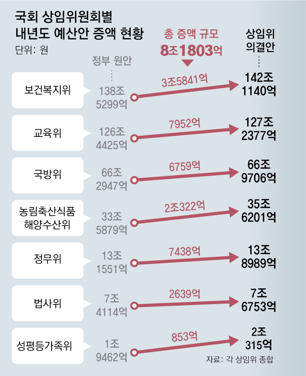 17일 각 상임위에 따르면 16일까지 심사를 마친 농림축산식품해양수산위원회와 보건복지위원회 등 상임위 7곳이 증액한 예산은 총 8조1803억 원으로 집계됐다.