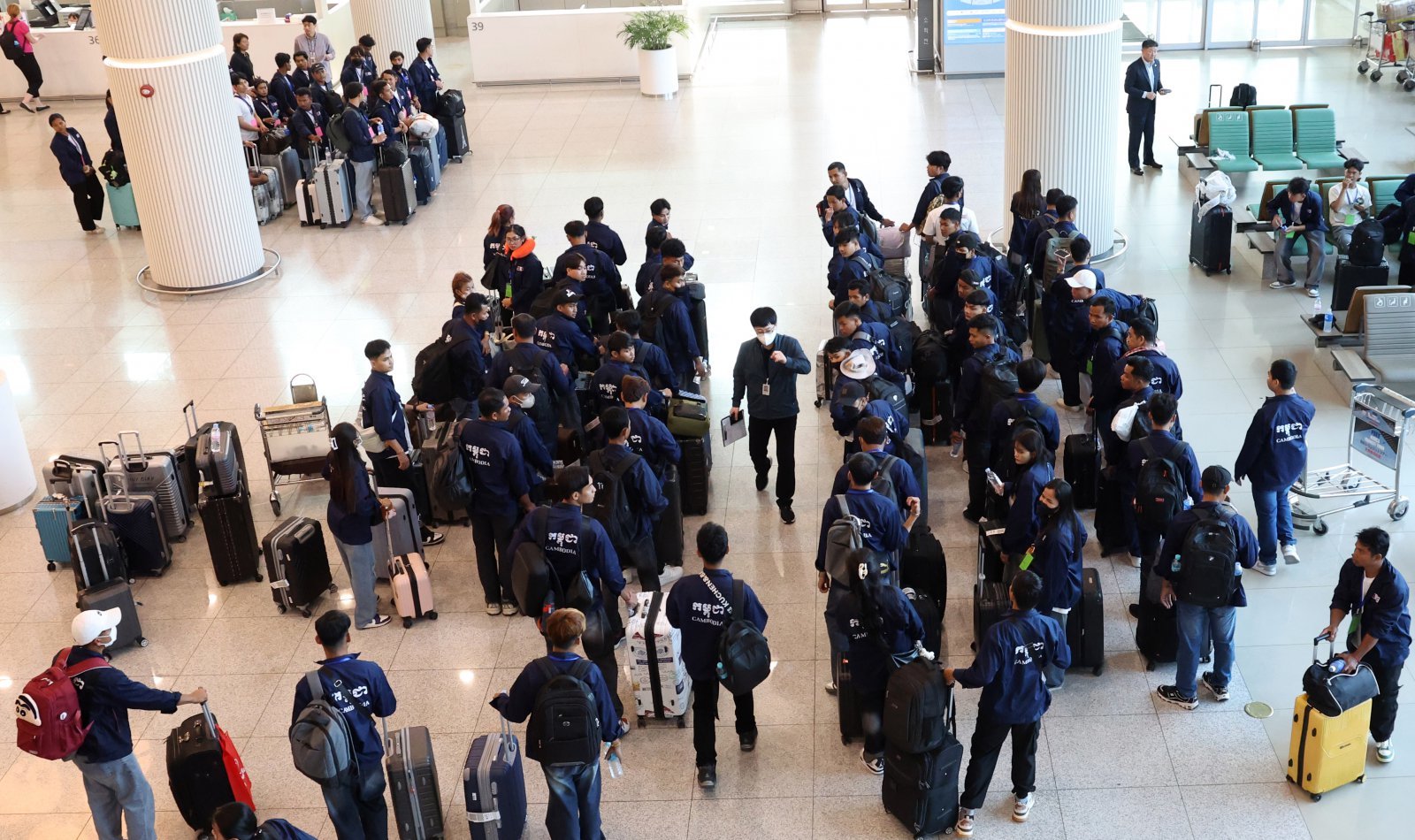 인천공항에서 E9비자로 입국한 캄보디아 노동자들이 이동을 하기위해 줄지어 기다리고 있다. ⓒ News1