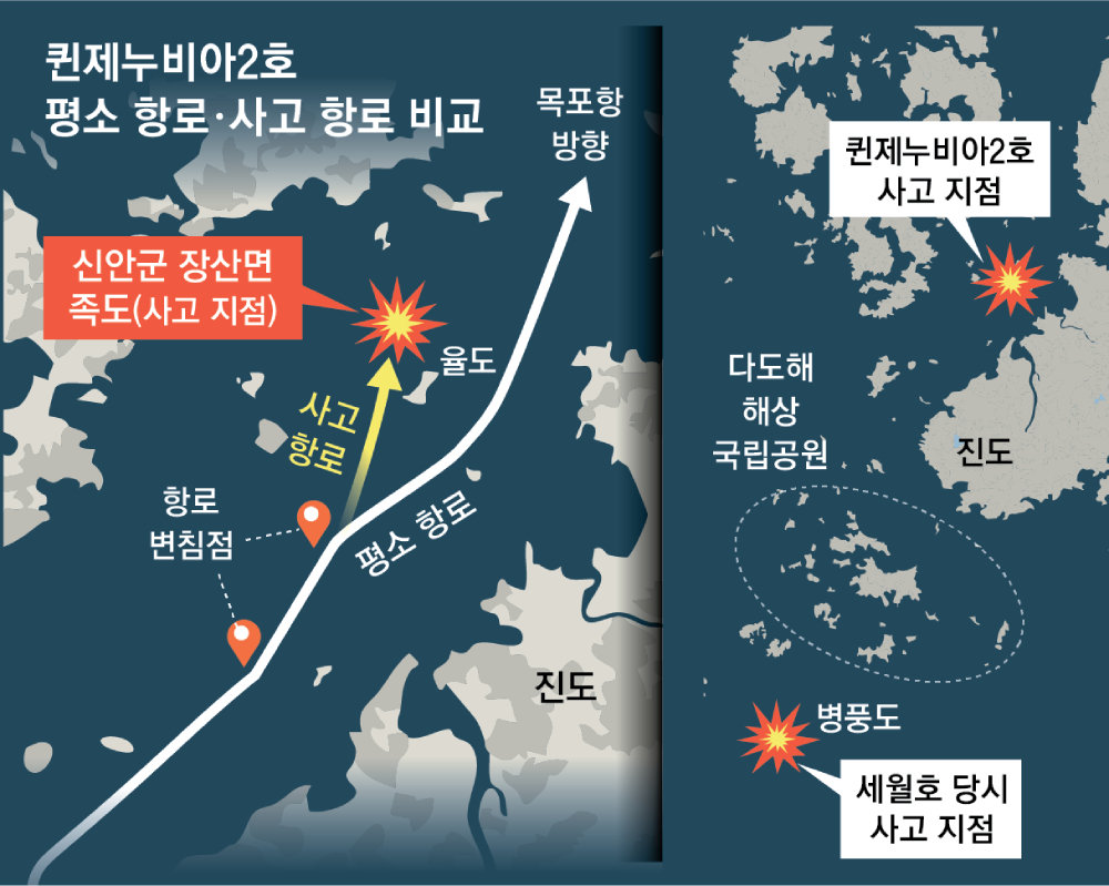 경찰에 따르면 사고 당시 퀸제누비아2호는 자동항법장치로 움직였다. 박 씨는 초동 조사에서 “방향타가 작동하지 않았다”고 주장했다가 나중에 “휴대전화로 네이버 뉴스를 보는 등 잠시 한눈을 팔다가 운항을 수동으로 전환하지 못했다”고 번복한 것으로 알려졌다. 족도와 충돌하기 100m 전에야 충돌 위험을 알게 돼 항로를 미처 변경하지 못했다는 설명이다. 해경은 박 씨가 암초 등을 살펴볼 수 있는 레이다 장비가 있는 좌석에 앉았는데도 이를 사전에 알지 못한 경위를 조사 중이다.