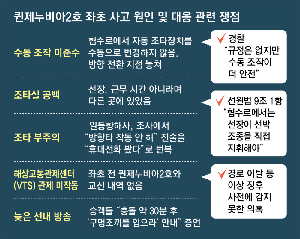 퀸제누비아2호 선장인 김모 씨(65)는 사고 당시 조타실에 없었던 것으로 확인됐다. 김 과장은 “당시 선장은 근무 시간이 아닌 것으로 확인됐다”며 “좁은 물길을 지날 때는 (선장이) 규정상 조타실에 나와야 하는데 평소에도 나오지 않았던 것으로 추정된다”고 말했다. 선원법 9조 1항은 좁은 수로를 지날 때 선장이 직접 배를 지휘해야 한다고 규정한다. 휴식 시간에는 일등항해사에게 조종을 맡길 수 있지만, 좁은 수로를 지나거나 항구를 출입하는 등 선박에 위험이 발생할 가능성이 높을 때는 직접 지휘해야 한다.