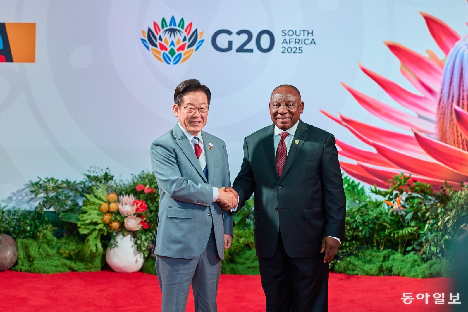 이재명 대통령이 22일(현지시간) 남아프리카공화국에서 열리는 주요 20개국(G20) 정상회의에 도착해 시릴 라마포사 남아공 대통령과 악수하며 인사를 나누고 있다. 2025.11.22 대통령실사진기자단 송은석 기자 silverstone@donga.com