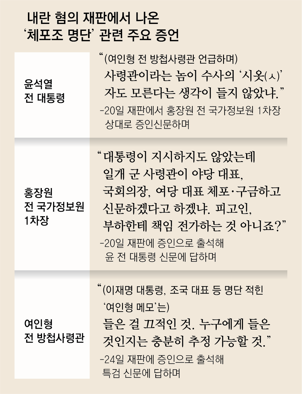반면 여 전 사령관은 지난해 11월 9일 휴대전화 메모에 이 대통령 등의 명단을 적은 이유에 대해 “스스로 적은 게 아니라 누군가한테 들은 것을 적은 내용”이라고 했다. “김용현 전 국방부 장관에게 들은 걸 메모한 것이냐. 점심에 장관 보고 때 들은 걸 적은 거라고 해서 물어본다”는 특검 질문에는 “충분히 추정 가능하겠지만 증언 거부하겠다”고 답했다. 사실상 김 전 장관 등 상부의 지시로 체포조 명단을 받아 적었다는 취지로 해석된다. 앞서 윤 전 대통령은 20일 공판에선 홍장원 전 국가정보원 1차장에게 “‘사령관이라는 놈이 수사의 시옷 자도 모른다’는 생각이 들지 않았냐. 대통령은 검찰총장까지 지낸 사람인데 어떻게 이런 걸 시키고 여 전 사령관은 지시를 받아 이런 걸 부탁한다는 게 연결이 안 되지 않느냐”며 여 전 사령관에게 책임을 떠넘기는 발언을 했다.