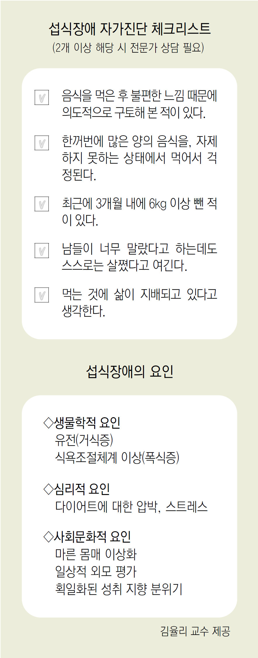 흔히 ‘섭식장애는 다이어트로 인한 질환’이라고 여긴다. 잘못된 고정관념이다. 김 교수는 “심리, 환경, 유전 요인이 함께 작용해 발병한다”며 “다이어트를 원인으로 볼 순 없지만 방아쇠 역할을 하는 경우는 많다”고 했다.