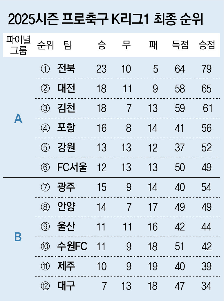 대구는 30일 열린 안양과의 2025시즌 K리그1 최종 38라운드 안방경기에서 2-2로 비겼다. 승점 34를 기록한 대구는 이날 울산을 1-0으로 꺾은 11위 제주(승점 39)에 5점 차로 밀리며 최하위(12위)에 그쳐 K리그2로 강등됐다. K리그1 12위는 다음 시즌 K리그2로 ‘다이렉트 강등’되고 10, 11위는 K리그2 팀과 승강 플레이오프(PO)를 치른다. 2016년 K리그 챌린지(현 K리그2) 2위로 승격해 K리그1에서 경쟁해 왔던 대구는 다음 시즌을 10년 만에 2부 리그에서 시작하게 됐다.