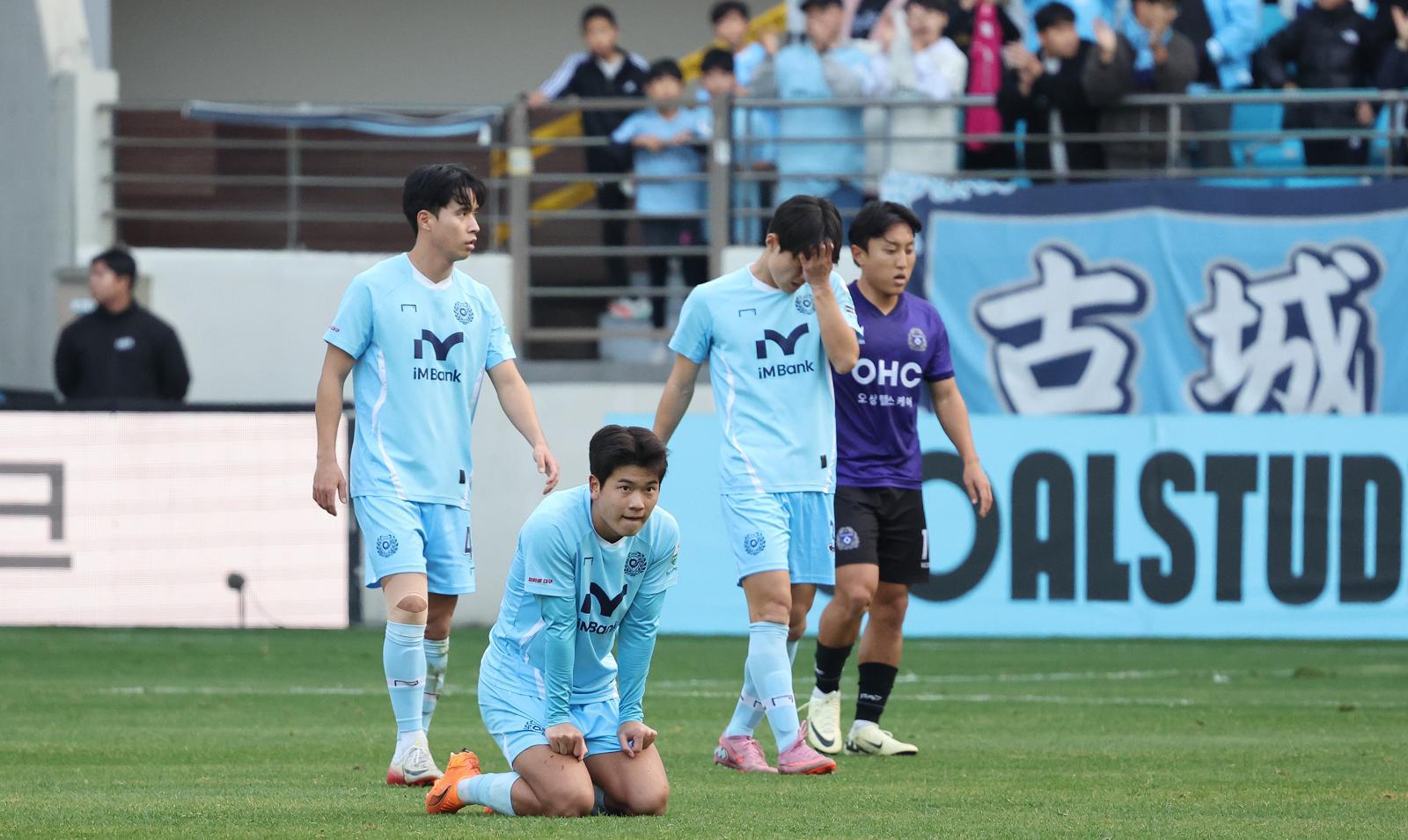 10년 만에 2부로 추락 프로축구 K리그1(1부) 대구 선수들이 30일 열린 안양과의 2025시즌 K리그1 최종 38라운드 안방경기에서 2-2로 비겨 ‘다이렉트 강등’이 확정되자 아쉬워하고 있다. 올 시즌 K리그1 12개 팀 중 최하위에 그친 대구는 다음 시즌을 2016년 이후 10년 만에 K리그2(2부)에서 시작하게 됐다. 대구=뉴시스
