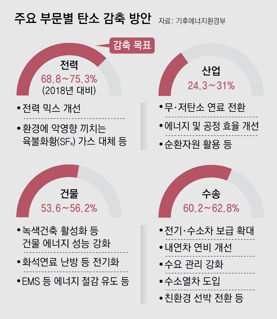 2018년 대비 24.3∼31%의 탄소를 감축해야 하는 산업 부문에서는 무·저탄소로 연료를 전환한다. 가치가 높은 순환자원 활용으로 에너지 감축에 나선다. 철강 업종에서는 용광로보다 탄소 배출이 70∼80% 적은 철강 생산 방식인 전기로강 생산을 늘리고 탄소를 줄이는 대체 철원을 적극 활용한다.