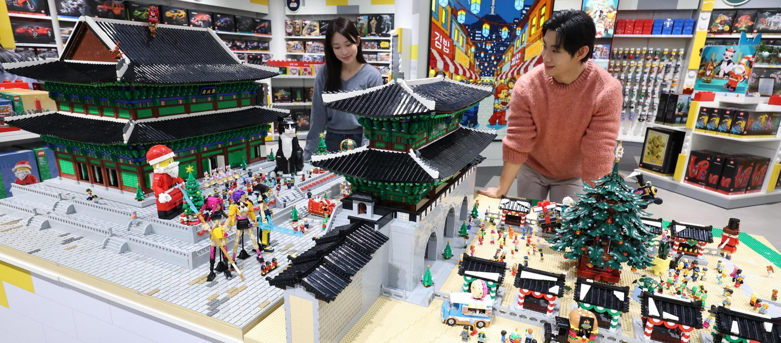 4일 오전 서울 용산구 아이파크몰 용산점 리빙파크 6층 ‘레고스토어 용산점’에서 모델들이 K컬처 테마로 꾸려진 레고 작품을 관람하고 있다. 5일 정식 오픈하는 이번 매장은 7일까지 한정 프로모션을, 8일부터 크리스마스 이벤트를 진행할 계획이다.