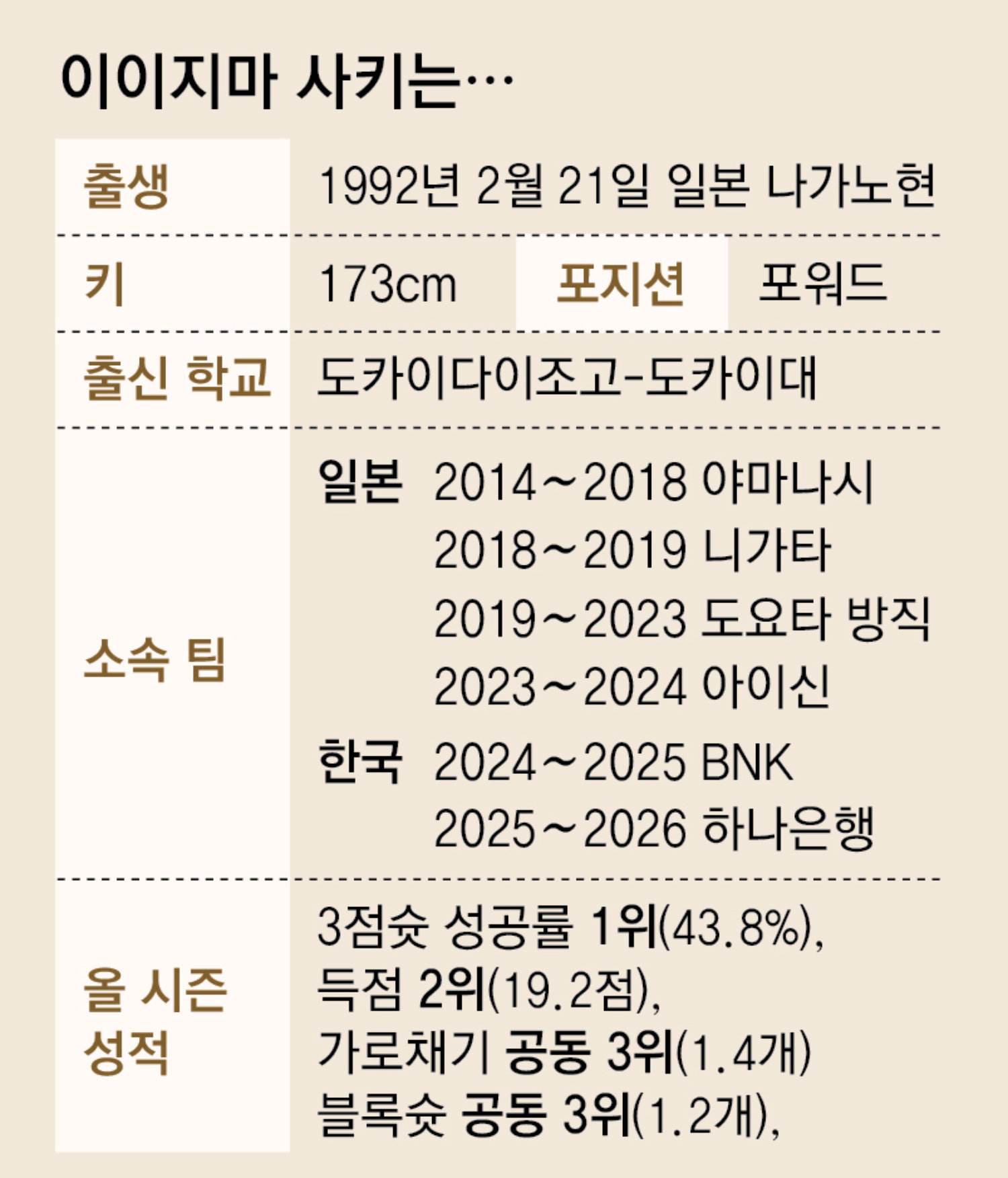 이이지마 사키(32·일본)는 6월 열린 2025∼2026시즌 여자프로농구(WKBL) 아시아쿼터 선수 드래프트에서 전체 1순위로 하나은행의 지명을 받은 뒤 이렇게 말했다. 반년이 지나 이번 시즌 1라운드를 마친 4일 현재 이이지마는 자신의 약속대로 경기당 평균 19.2점(득점 2위)을 기록하며 시즌 초반 하나은행의 돌풍을 이끌고 있다.