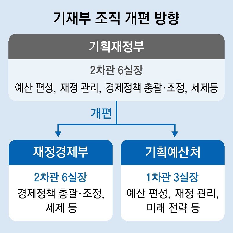 내년 1월 2일부터 기획재정부를 재정경제부와 기획예산처로 분리하는 개편 작업이 조만간 마무리된다. 재정경제부는 정책 컨트롤타워로서 ‘조정’ 기능에 초점을 두고, 기획예산처는 중장기 미래 전략을 마련하는 ‘기획’ 기능에 집중할 것으로 전망된다.