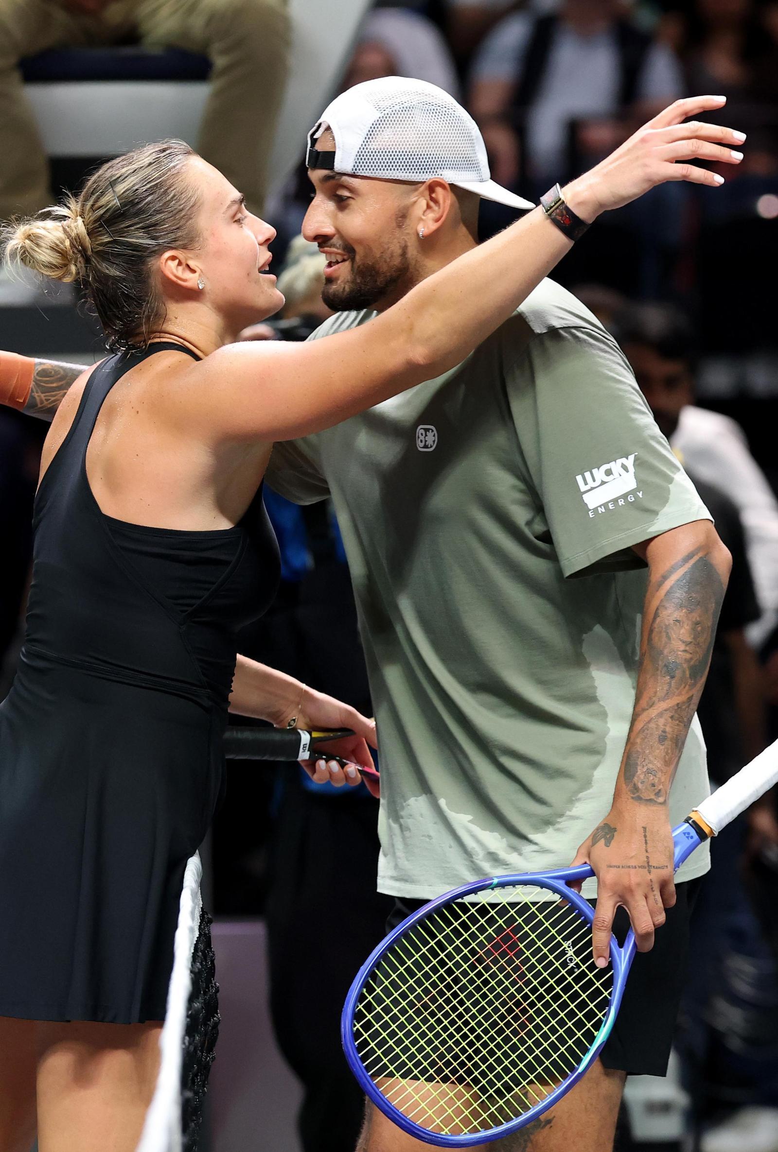 남자프로테니스(ATP) 단식 랭킹 671위 닉 키리오스(오른쪽)가 28일(현지 시간) 아랍에미리트(UAE)에서 열린 이벤트 경기 ‘배틀 오브 더 섹시스(Battle of the Sexes)’에서 여자프로테니스(WTA) 1위 아리나 사발렌카에게 승리한 뒤 포옹하고 있다. 키리오스는 테니스 사상 4번째로 열린 이번 성 대결에서 2-0으로 완승했다.