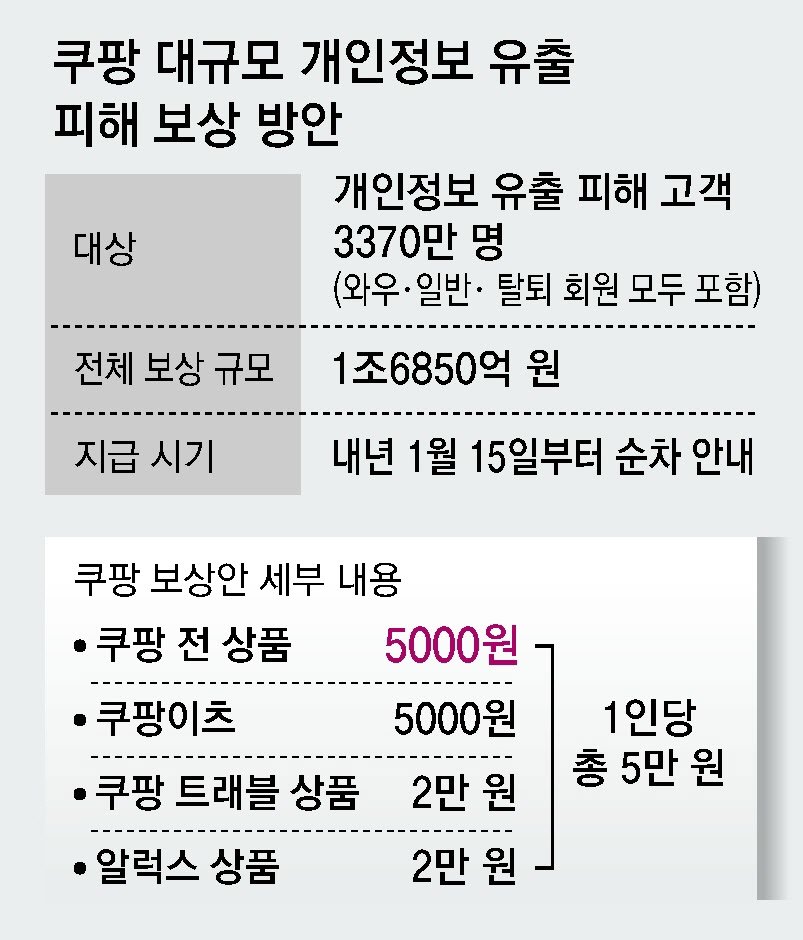 쿠팡이 3370만 명 대규모 개인정보 유출 사태 한 달여 만인 29일 1인당 5만 원 상당의 이용권을 지급하는 내용의 보상안을 내놨지만 오히려 비판 여론은 커지고 있다. 5만 원 가운데 소비자가 쿠팡에서 자유롭게 쓸 수 있는 금액은 5000원뿐이다. 30일 국회 청문회를 하루 앞두고 나온 보상안에 대해 부정적 여론이 잇따르는 가운데 생색내기용이라는 비판이 많다.