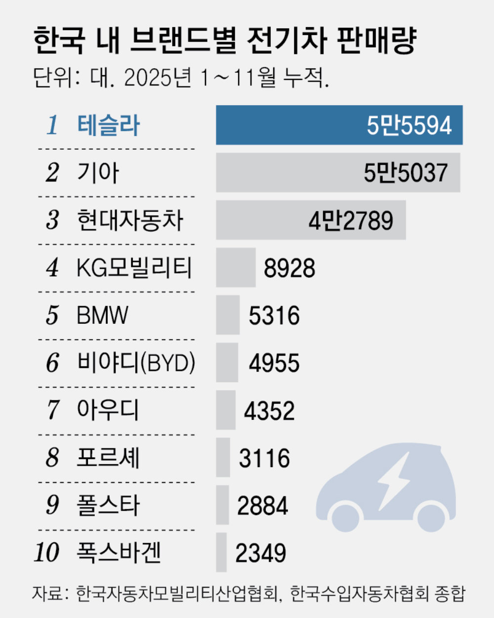 이번 가격 인하는 한국 내 전기차 시장의 수입차 브랜드 상승세 속에서 주도권을 쥐려는 전략적 선택으로 풀이된다. 한국자동차모빌리티산업협회와 한국수입자동차협회에 따르면 테슬라는 지난해 11월까지 누적 5만5594대를 판매해 기아(5만5037대)와 현대자동차(4만2789대)를 제치고 1위에 올랐다. 이 흐름이 12월까지 지속됐을 경우 국산차 강세였던 국내 전기차 시장에서 수입차 브랜드가 처음 정상에 오를 가능성이 있다.