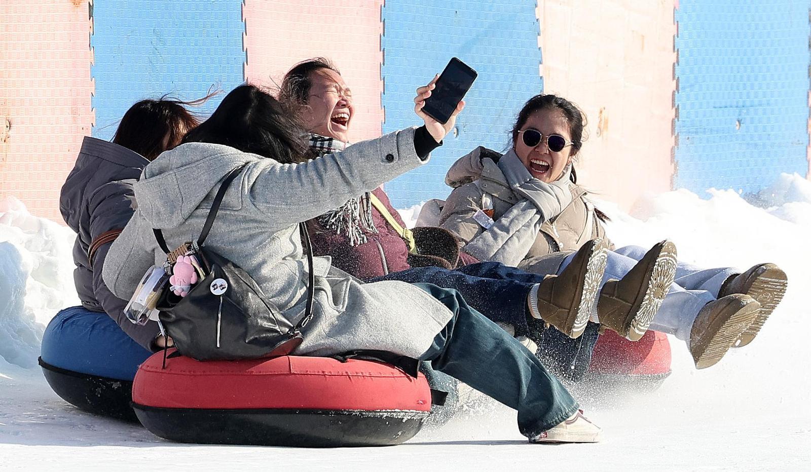 4일 서울 광진구 뚝섬한강공원 눈썰매장을 찾은 외국인 관광객들이 눈썰매 위에서 셀카를 찍으며 즐거워하고 있다. 전국 한파특보는 모두 해제돼 5일 아침 최저기온은 영하 10도∼영상 2도, 낮 최고기온은 0도∼영상 10도로 평년과 비슷한 수준을 유지하겠다.