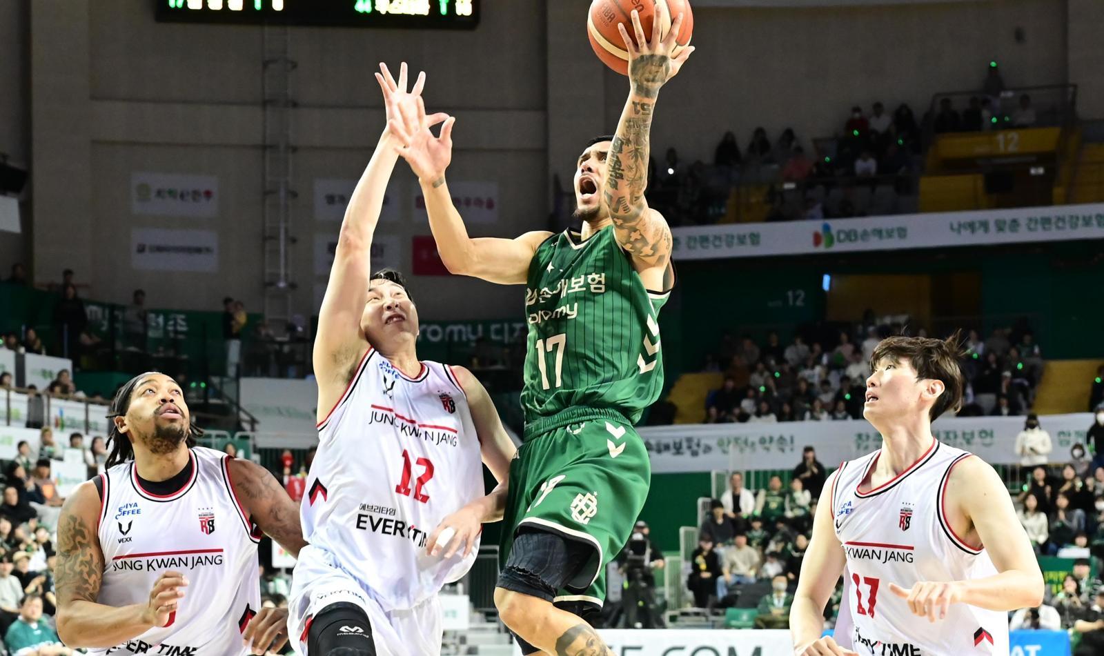 프로농구 DB 이선 알바노(오른쪽에서 두 번째)가 11일 안방 원주 DB프로미아레나에서 열린 정관장과의 경기에서 상대 수비수를 제치고 골밑슛을 시도하고 있다. 알바노는 이날 정관장의 강한 수비에 막혀 3득점에 그쳤지만 12도움을 기록하며 팀의 73-65 승리를 이끌었다. KBL 제공