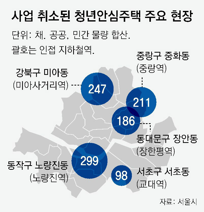 21일 서울시에 따르면 지난해 청년안심주택(옛 역세권 청년주택 포함) 7곳에서 1316채 규모 공급 계획이 해제됐다. 2024년 한 해에 준공된 물량(3709채)의 35.5% 수준이다. 구체적으로는 △노량진역(299채) △미아사거리역(247채) △중랑역(211채) △장한평역(186채) △보문역(142채) △거여역(133채) △교대역(98채) 등이 있다. 신규 인허가 현장은 한 곳도 없었다.