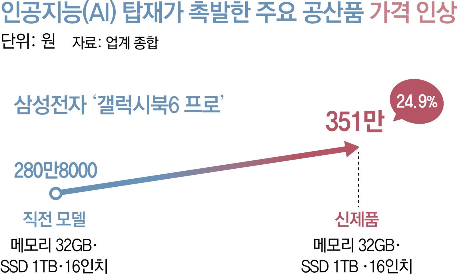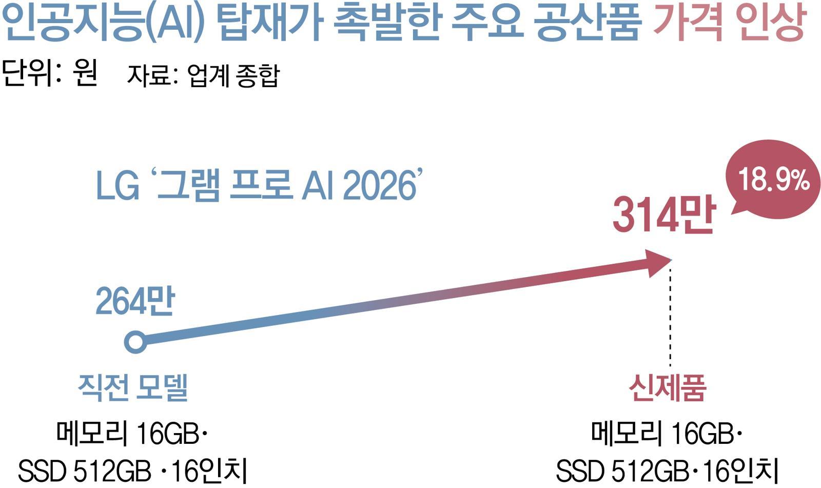 LG전자도 이달 초 생성형 AI를 적용한 2026년형 LG 그램을 공개했는데, 16인치 제품 출고가(메모리 16GB, SSD 512GB)가 314만 원이었다. 지난해 동급 대비 약 50만 원 인상됐다. 해외 업체들도 마찬가지다. 델은 지난해 12월부터 주요 제품 가격을 15∼20% 인상했다.