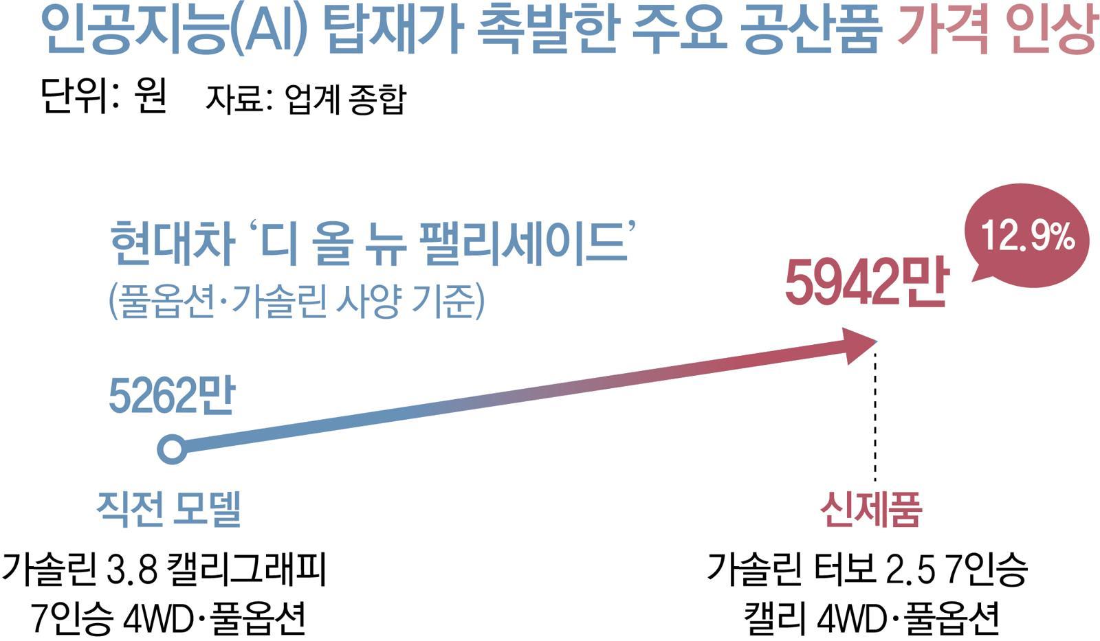 자동차 업계에선 이미 AI 도입에 따라 가격이 오르는 현상이 나타나고 있다. 지난해 출시된 현대자동차 팰리세이드는 2025년형 신모델인 ‘디 올 뉴 팰리세이드’에서 AI 어시스턴트 기능이 최하위 세부옵션(트림)부터 기본 적용됐다. “에어컨 틀어줘” 등 음성을 인식하고 수행하는 기능이다. 첨단운전자보조시스템(ADAS)도 업그레이드됐다.