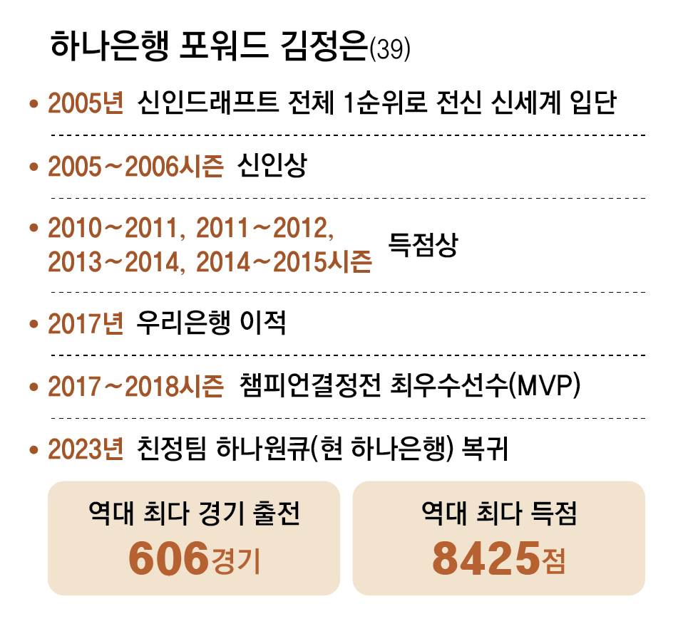 김정은은 2005∼2006시즌 신인드래프트 전체 1순위로 신세계 유니폼을 입었다. 팀 간판으로 활약하다 2016∼2017시즌 종료 후 자유계약선수(FA) 자격을 얻어 우리은행으로 떠났다. 그리고 2023∼2024시즌을 앞두고 6년 만에 하나은행으로 돌아오면서 “팀을 더 높은 곳에 올려놓겠다”고 자신과 약속했다. 이 약속을 지키지 못했기에 5번이나 수술대에 올랐던 자신에게 ‘1년 더’를 부탁했다.