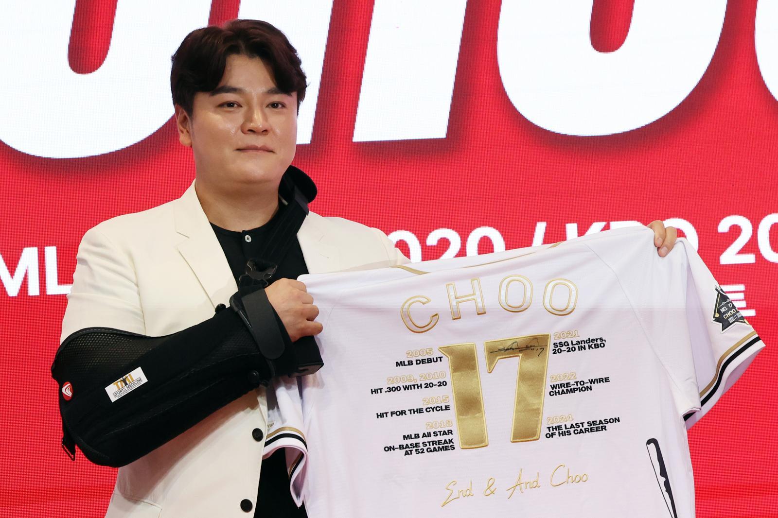 추신수 SSG 구단주 보좌 겸 육성총괄이 21일 미국 야구 명예의 전당 투표에서 3표를 받았다. 사진은 2024년 11월 은퇴 기자회견 때 유니폼을 펴 보이는 모습. 인천=뉴스1