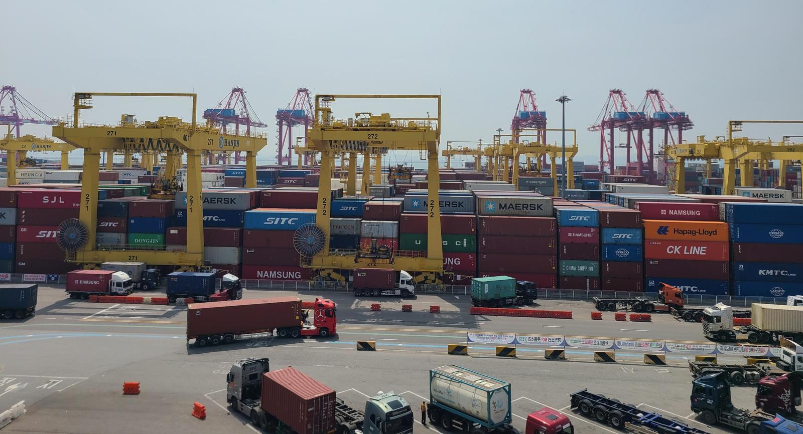 인천 연수구 송도국제도시 해안가에 있는 인천항 부두에서 화물차량들이 컨테이너를 운반하고 있다. 인천항만공사 제공