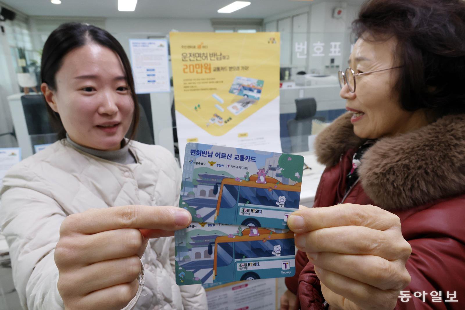 28일 서울 송파구 잠실6동 주민센터에서 한 고령 운전자가 운전면허 자진 반납을 신청한 뒤 선불형 교통카드를 받고 있다. 서울시는 ‘어르신 운전면허 자진반납 교통카드 지원사업’을 예년보다 앞당겨 1월부터 시행하고 있다. 1956년 12월 31일 이전에 출생한 70세 이상 어르신이 운전면허를 자진 반납하면 1인당 20만 원 상당의 교통카드를 선착순 지급한다.