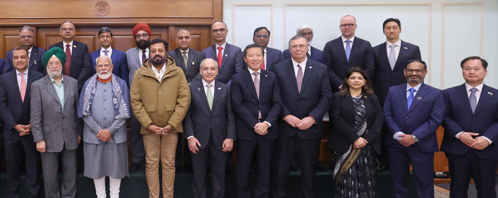 28일(현지 시간) 인도 뉴델리 총리 관저에서 진행된 ‘글로벌 에너지 리더 라운드테이블’ 행사에서 정기선 HD현대 회장(뒷줄 오른쪽), HD한국조선해양 김형관 대표(앞줄 오른쪽)가 나렌드라 모디 인도 총리(앞줄 왼쪽에서 세 번째)와 기념사진을 찍고 있다. 정 회장은 국내 기업인 중 유일하게 모디 총리의 초청을 받아 이번 행사에 참석했다. 인도 총리실 제공