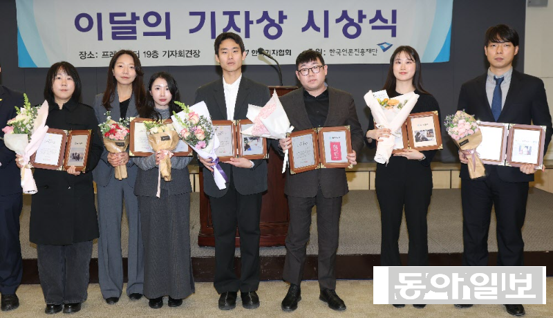 29일 서울 중구 한국프레스센터에서 동아일보 히어로콘텐츠팀(이상환 전혜진 박경민 최효정 김재희 박형기 봉주연 박초희 기자)이 ‘헌트: 치매머니 사냥’ 시리즈로 한국기자협회 제424회 이달의 기자상을 수상했다. 왼쪽부터 박초희 봉주연 최효정 박경민 이상환 전혜진 박형기 기자.
